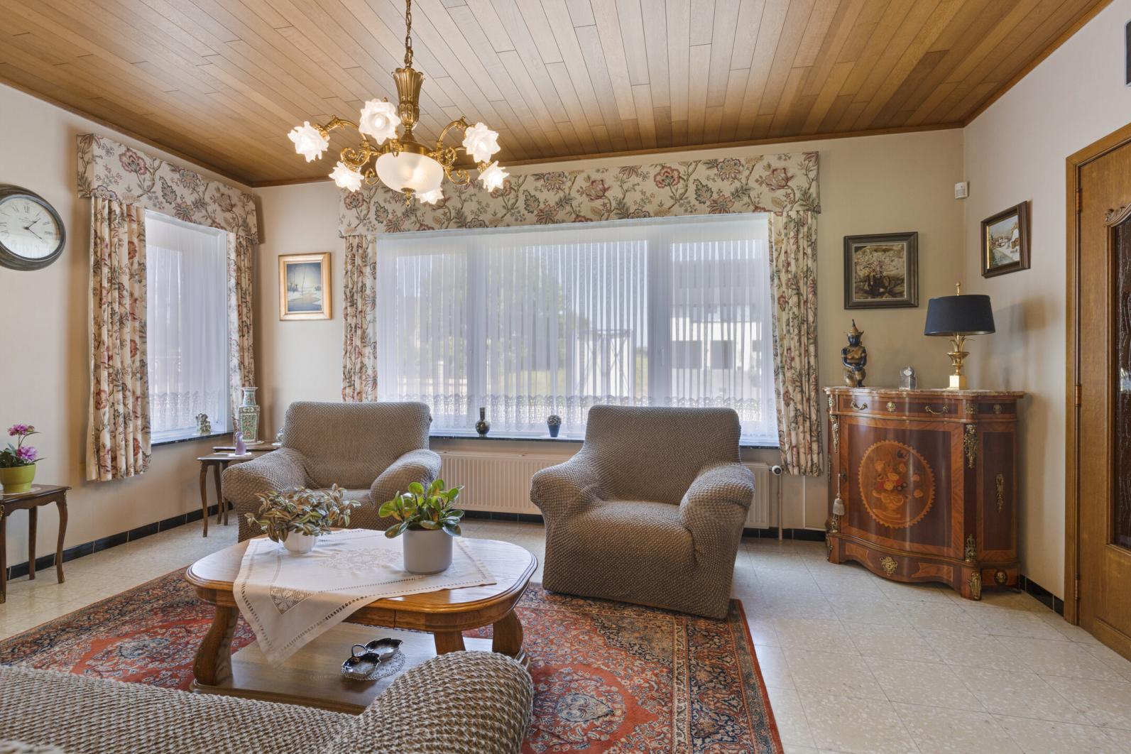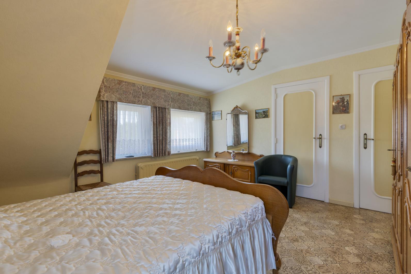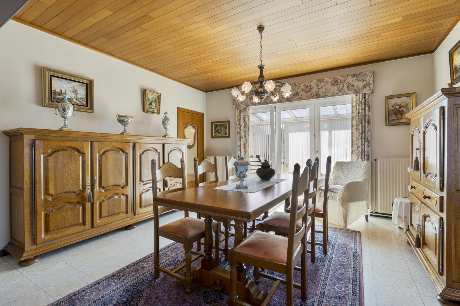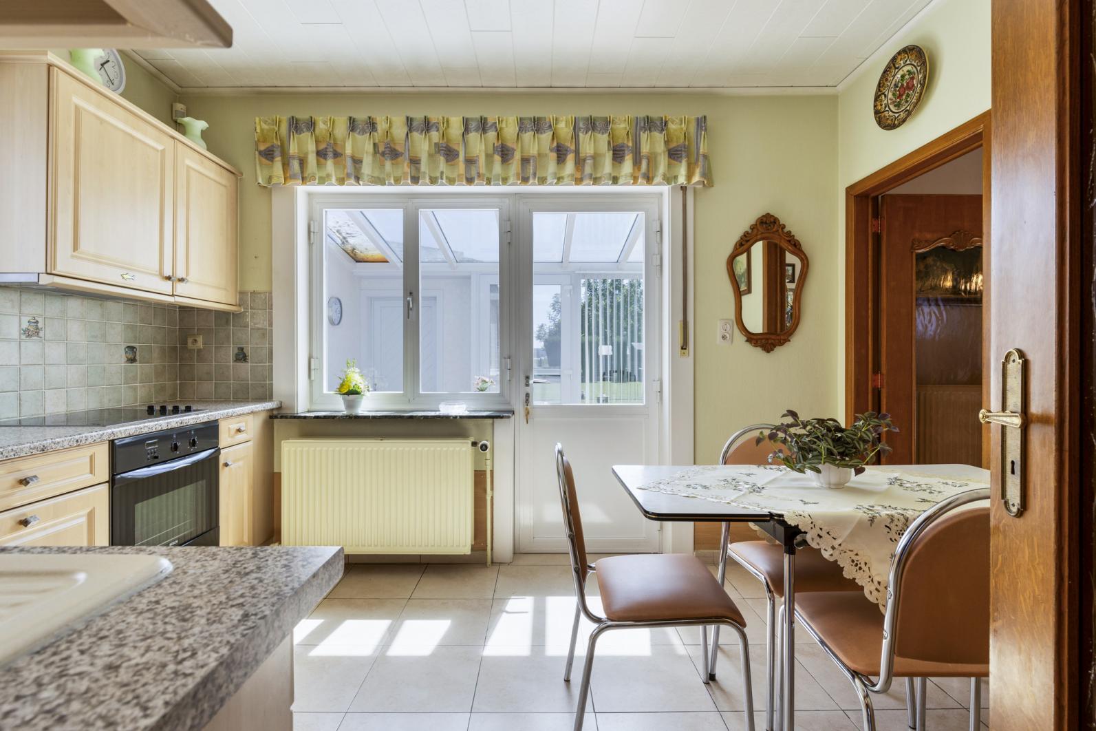 De woning is ingedeeld met inkom/gang met trap, ruime LICHTRIJKE leefruimte met salon en eetplaats, ingerichte keuken. Aansluitend aan de living en keuken bevindt zich een ruime veranda met mooi zicht op de zuiders gerichte goed onderhouden tuin. De veranda is eveneens voorzien van zonneluifel. Verder is er nog een middelmatige kelder, een garage en bergruimte. De weide achter de tuin is ideaal voor dierenliefhebbers. De bovenverdieping omvat nachthal, 3 slpks en een ingerichte badkamer. Alle ramen zijn voorzien van rolluiken. Centrale verwarming op stookolie.