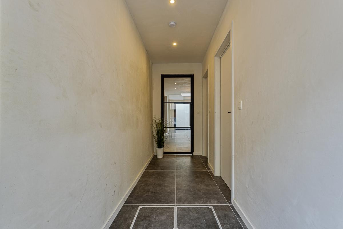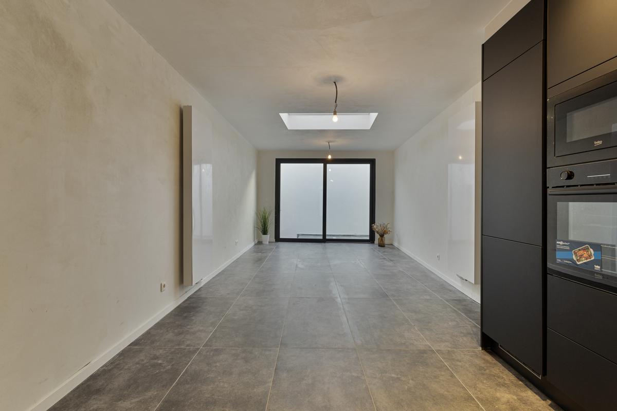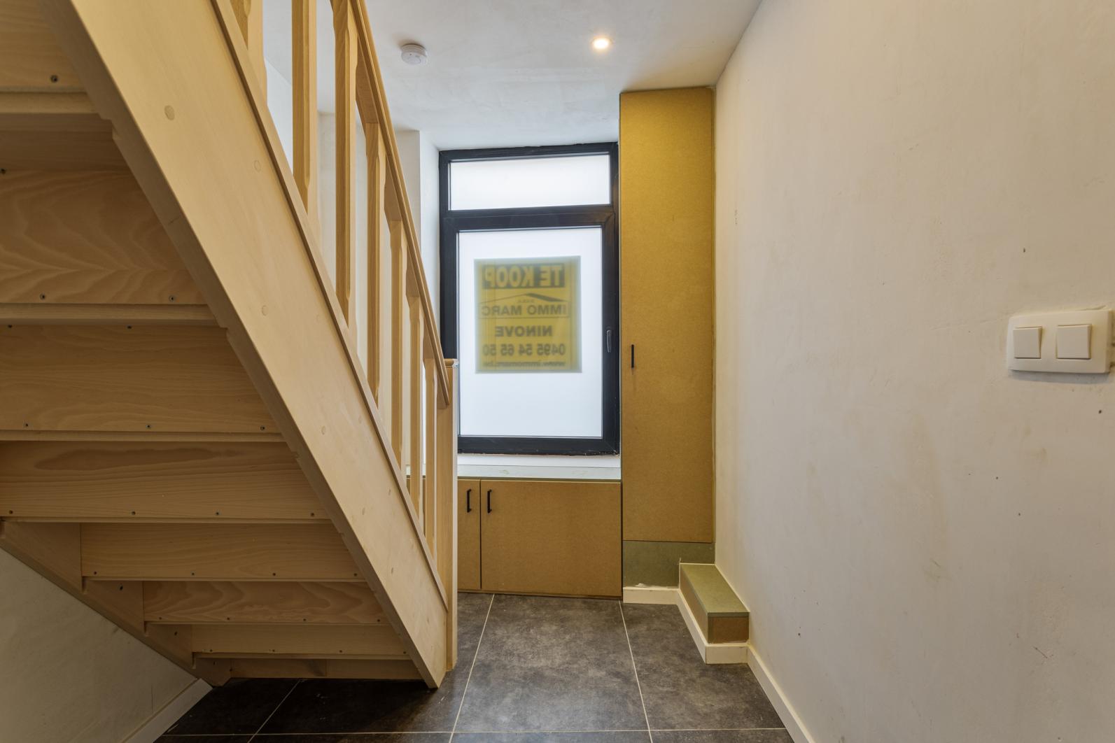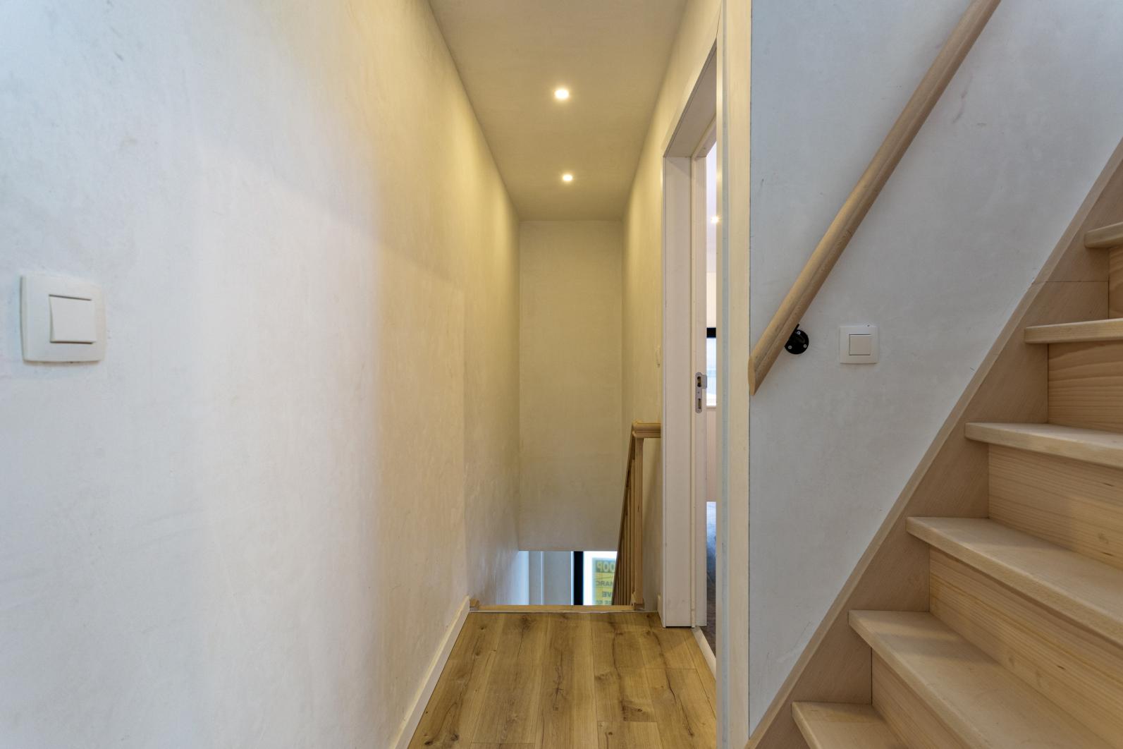 gang met trap naar bovenverdieping, gastentoilet, open LICHTRIJKE LEEFRUIMTE met ingerichte volledig uitgeruste keuken (oven, microgolf, ceramische ruime kookplaat, ruime frigo, vaatwas), aansluitend op de living/keuken treft met een aangelegd terras/koer met deur die toegang geeft naar zijdoorgang naar centrum.