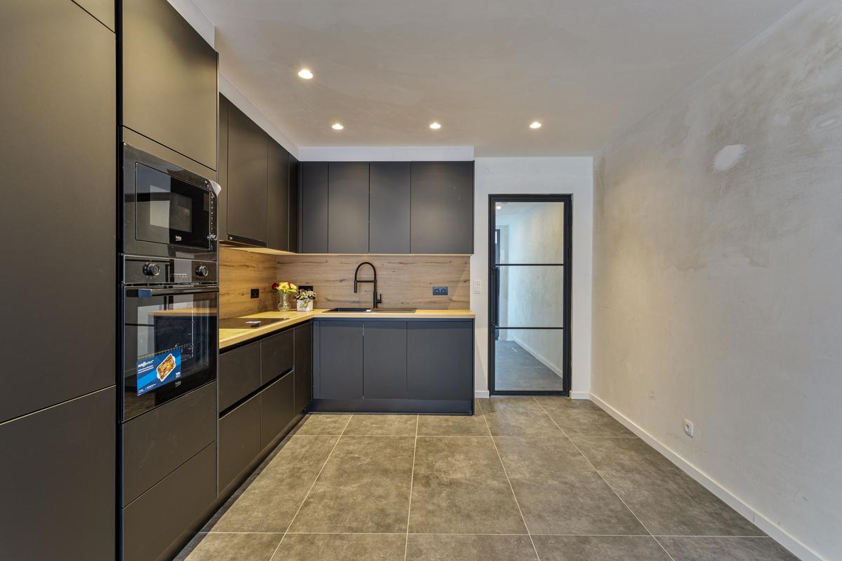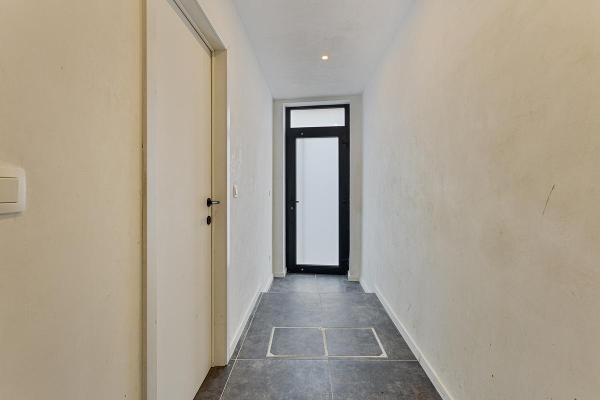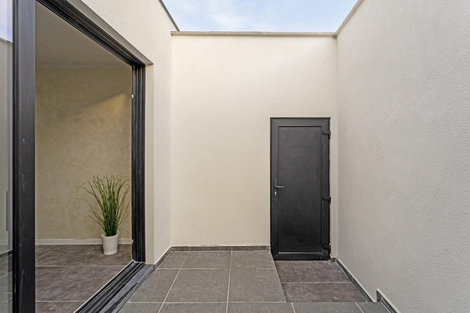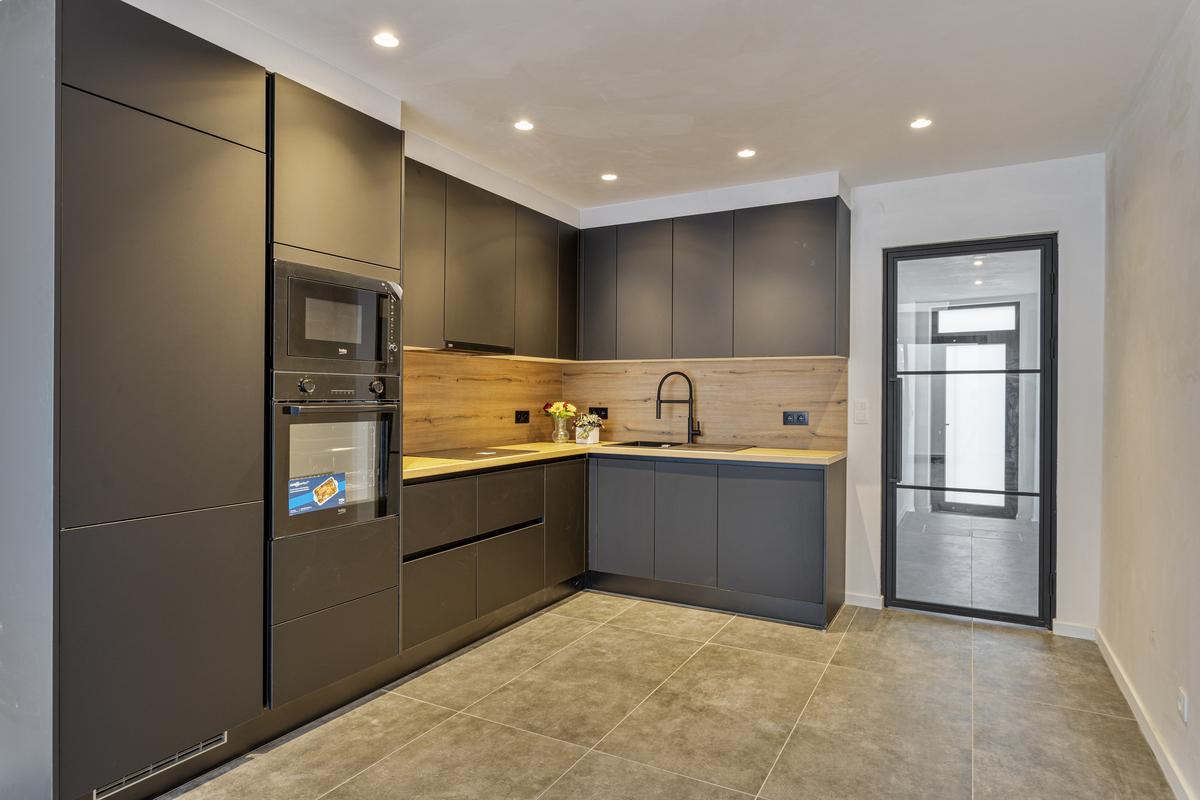 gang met trap naar bovenverdieping, gastentoilet, open LICHTRIJKE LEEFRUIMTE met ingerichte volledig uitgeruste keuken (oven, microgolf, ceramische ruime kookplaat, ruime frigo, vaatwas), aansluitend op de living/keuken treft met een aangelegd terras/koer met deur die toegang geeft naar zijdoorgang naar centrum.