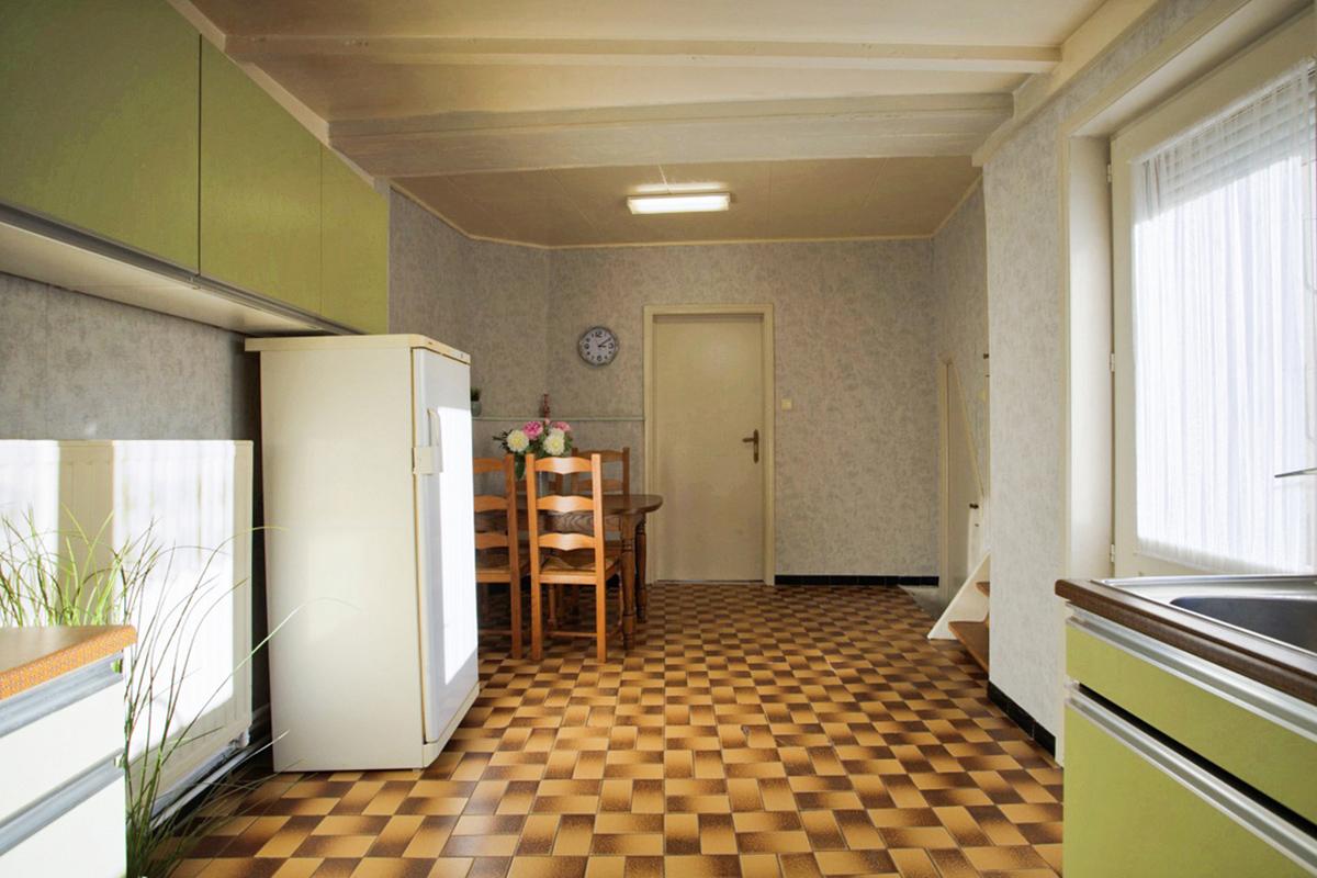 gelijkvloers is ingedeeld met inkom - leefruimte ( salon - eetplaats) -ingerichte keuken met aansluitend terras -verder bevindt zich nog een toilet en bijgebouw (ideaal om het woonhuis hiermee uit te breiden)