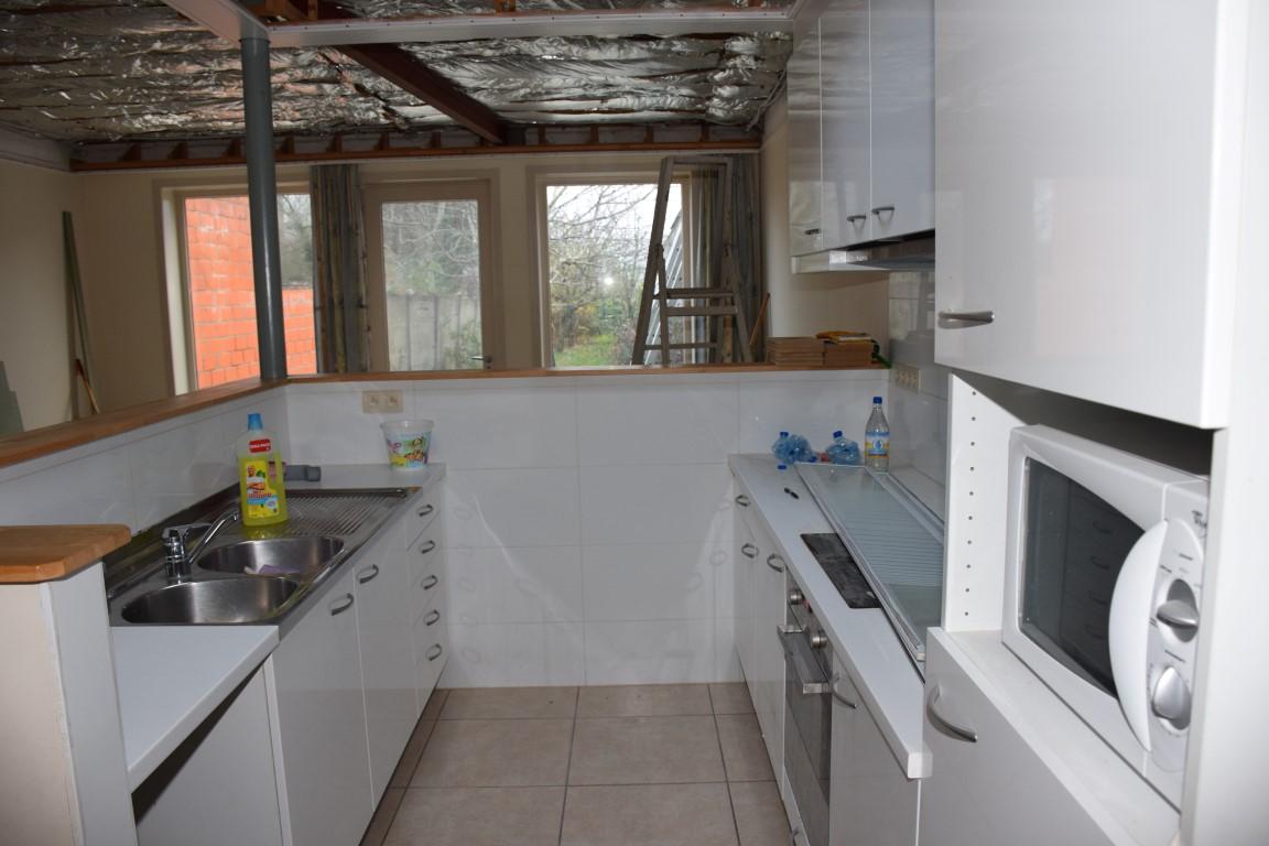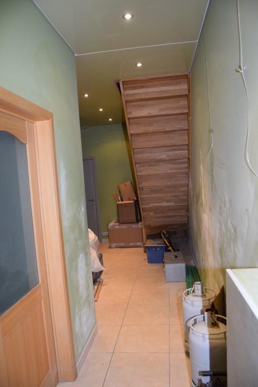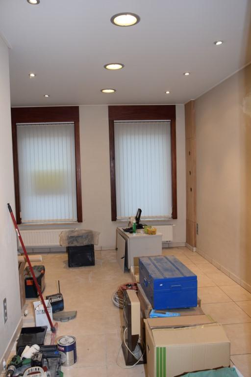 De woning omvat op de gelijkvloerse verdieping ruime inkomhal/gang met trap - bureelruimte (kan dienstig zijn voor handelsruimte/praktijkruimte) - toilet - ruime living met open ingerichte keuken - berging/chauffageplaats - kleine badkamer gelijkvloers met douche - ruim terras aansluitend met een grote tuin.