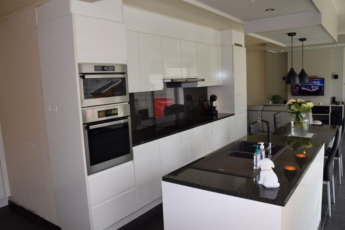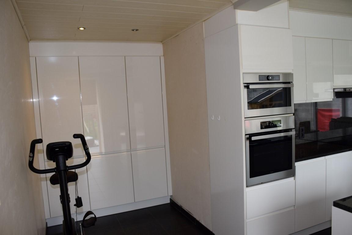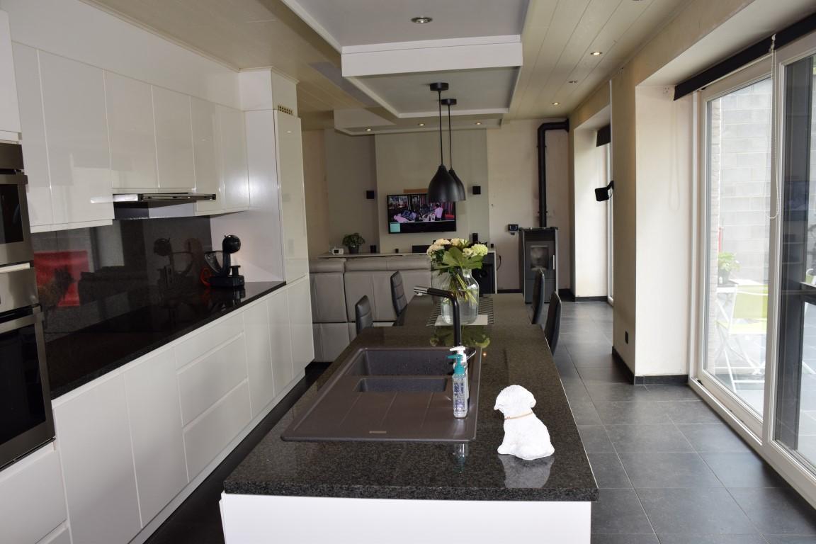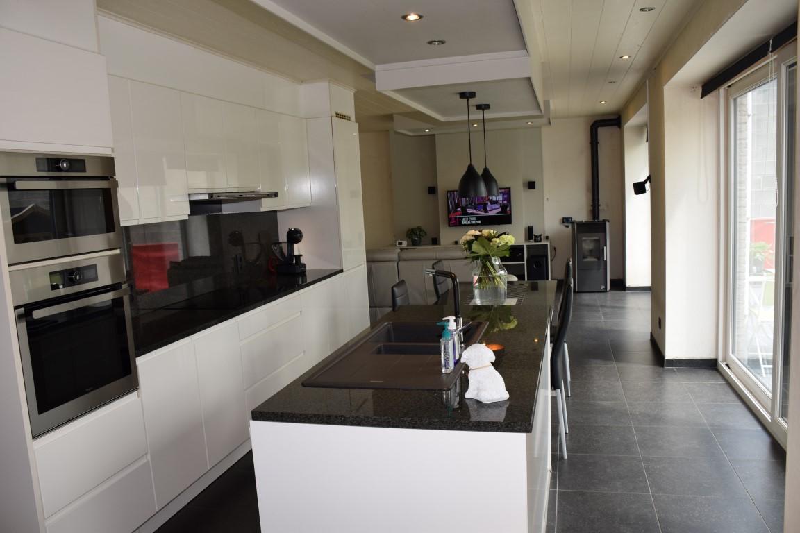 INDELING GELIJKVLOERS : inkom/gang - berging/wasruimte - gastentoilet - lichtrijjke living met open VOLLEDIG NIEUW INGERICHTE KEUKEN met eiland, de keuken is voorzien van alle nodige apparatuur (grote frigo; ceramische kookplaat, microgolf, oven, vaatwas), werkblad en opkanten in graniet, ook eiland voorzien van graniet + bijhorende granieten eettafel. Vanuit de living en keuken mooi zicht op het terras en de grote tuin (volledig omheind). Naast de keuken bevindt zich een gang die toegang geeft naar de tuin, de garage en de bovenverdieping. Deze omvat nachthal - 4 slaapkamers en een ruime ingerichte badkamer, via de trektrap in de gang begeeft men zich naar de zolderverdieping die nog kan ingericht worden voor 2 supplementaire slaapkamers.