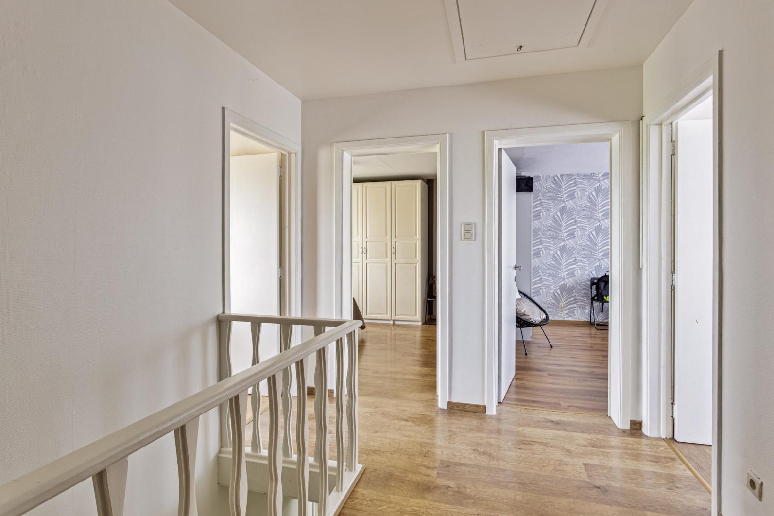 Het gelijkvloers omvat inkom, ruime lichtrijke leefruimte met eetplaats en salon, trap naar bovenverdieping, afzonderlijk ruime ingerichte keuken (voorzien van nodige apparatuur)en garage. De eerste verdieping beschikt over ruime nachthal, ingerichte badkamer en 3 slaapkamers. Via een trektrap in de ruime nachthal begeeft men zich naar de ruime zolder (die de mogelijkheid biedt voor meerdere slaapkamers.)