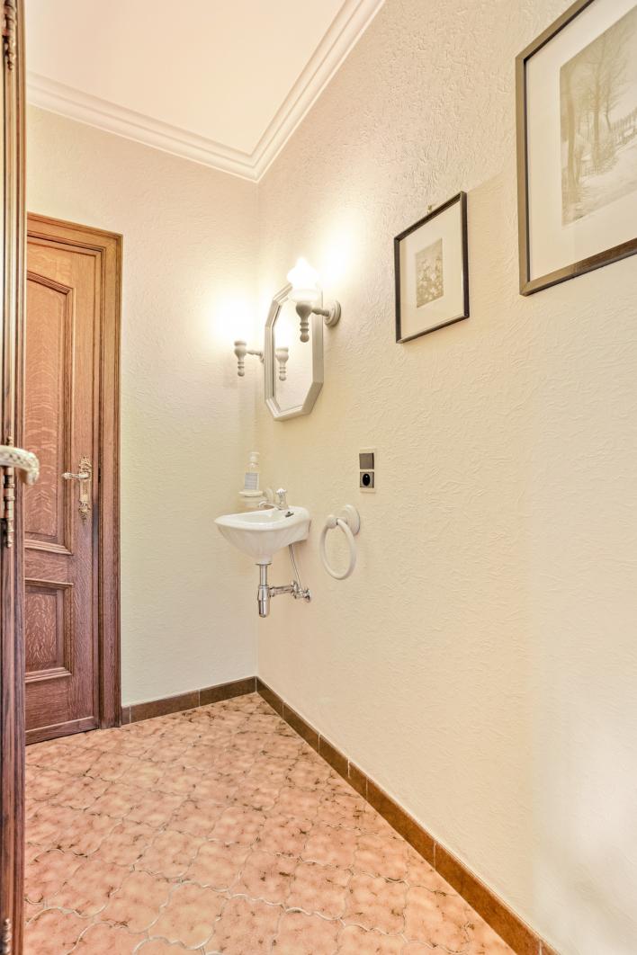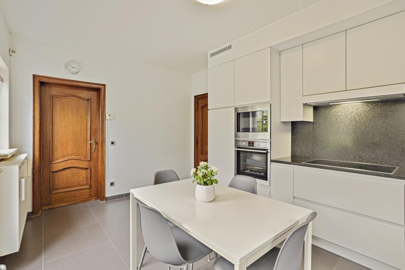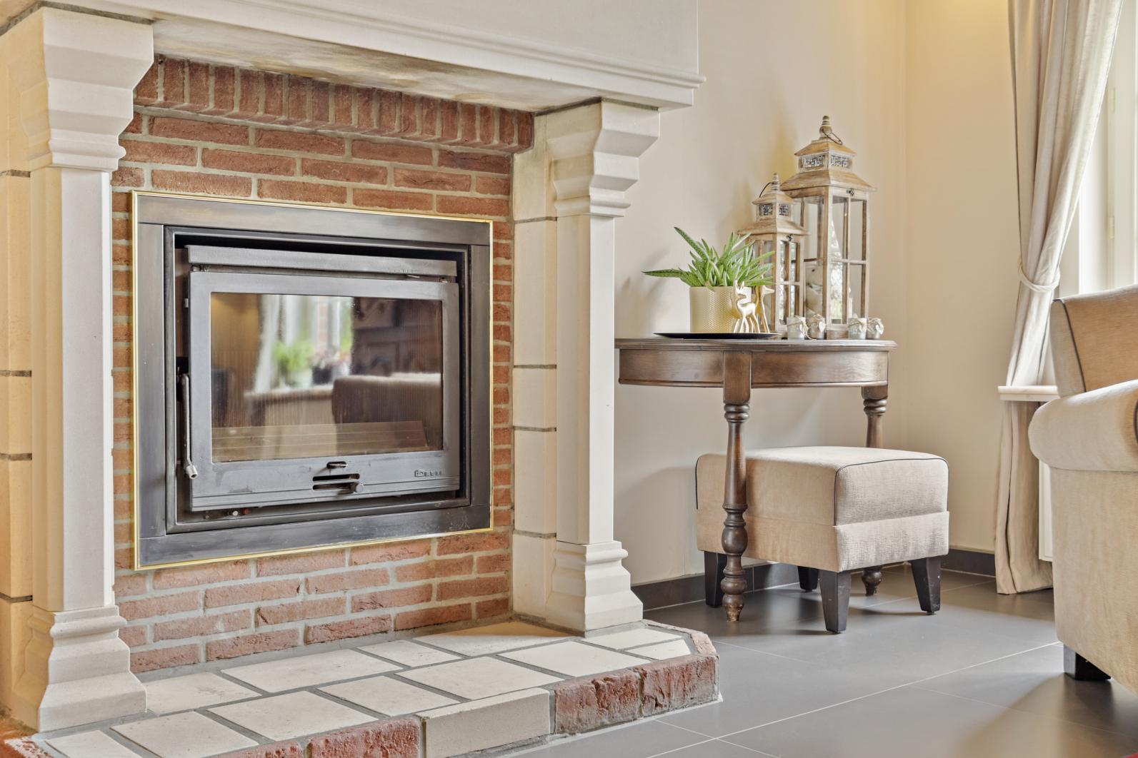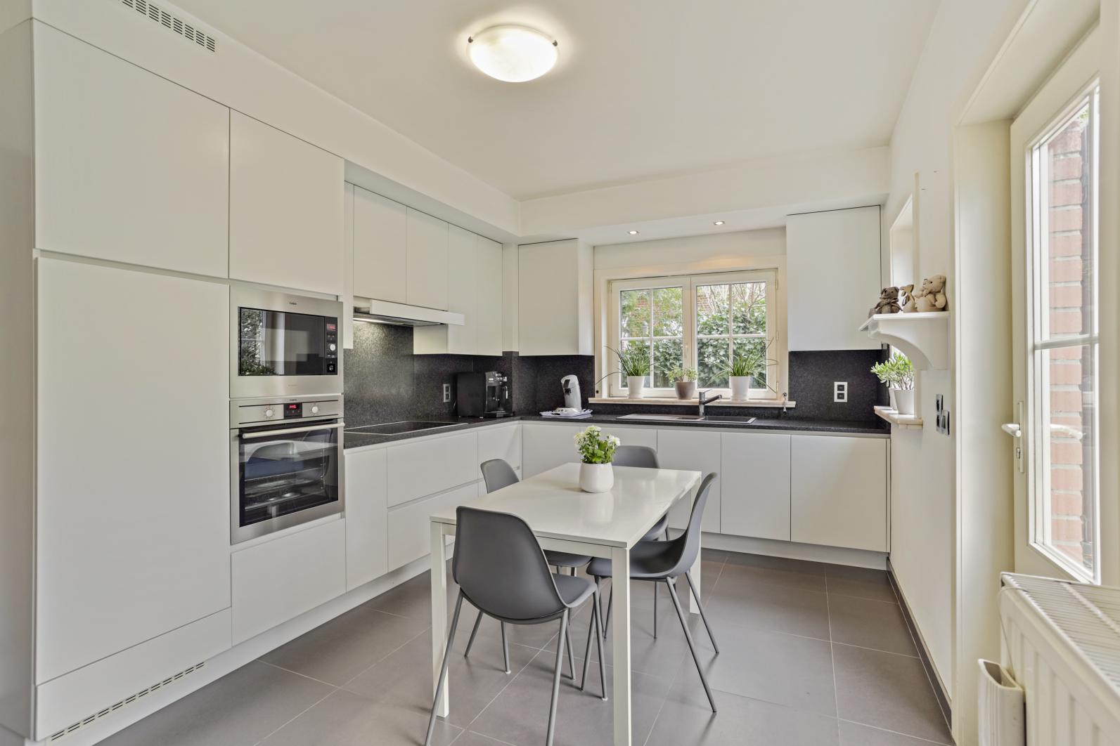 De lichtrijke woning heeft op het gelijkvloers een ruime inkomhal met trap, toilet, bureel, ruime woonkamer met sierschouw, ingerichte keuken (Dovy keukens) en een berging.