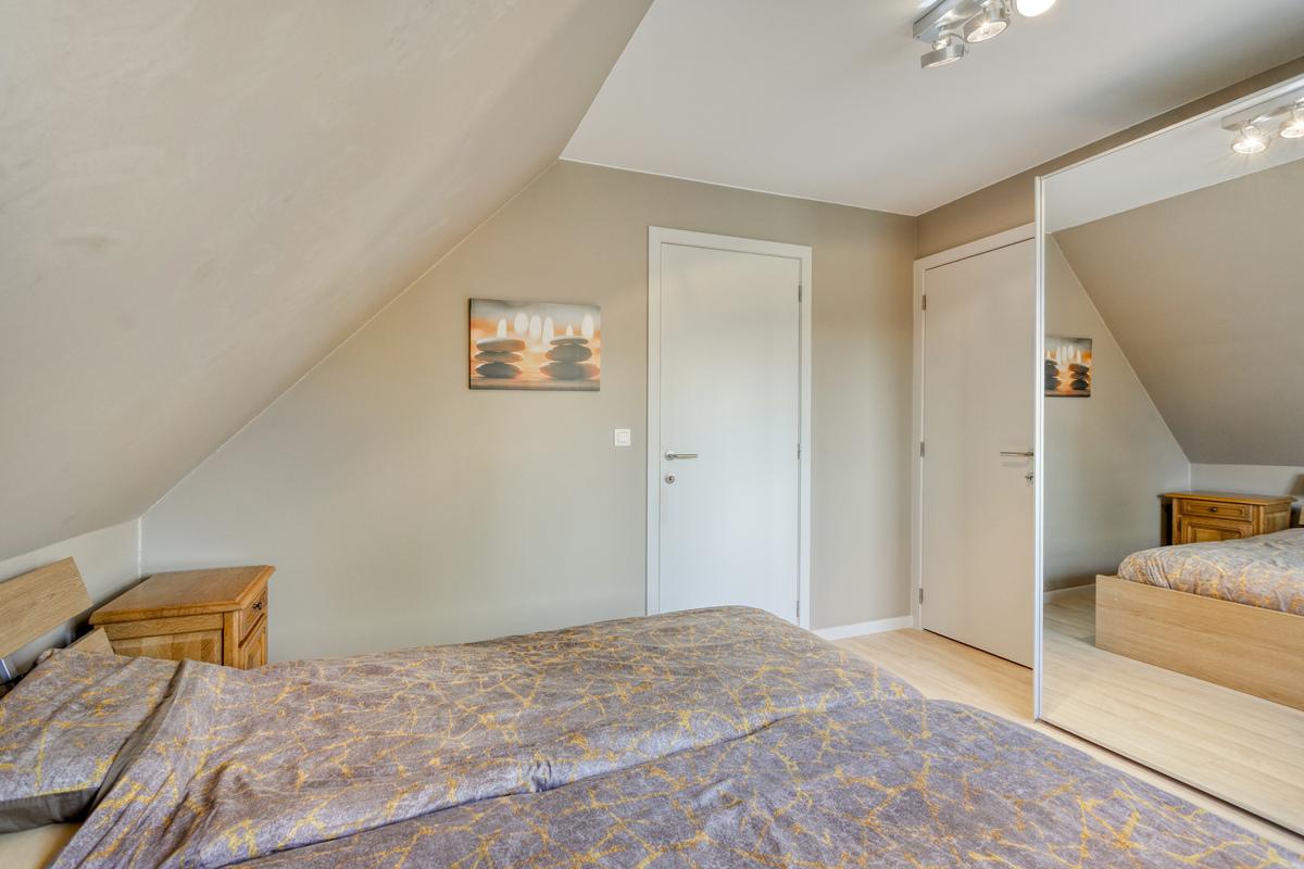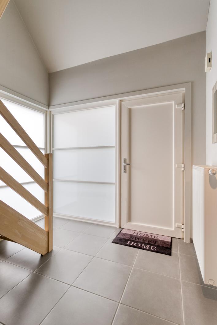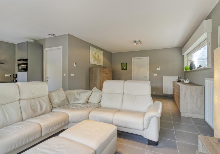 De woning is ingedeeld op gelijkvloers met lichtrijke inkomhal met trap, gastentoilet, lichtrijke leefruimte (salon, eetplaats) met open ingerichte keuken voorzien van alle nodige apparatuur en afgewerkt met granieten werkblad. Vanuit de leefruimte/salon en keuken en het mooi aangelegd ruim terras is het gezellig genieten van het uitzicht op de mooi aangelegde ruime siertuin, de tuin is volledig omheind, en vooraan voorzien van een automatische hek. Verder is er nog een ruime garage met bergruimte. De bovenverdieping omvat 2 slaapkamers, bergruimte en een ingerichte badkamer. De woning wordt verwarmd via centrale verwarming op aardgas.
