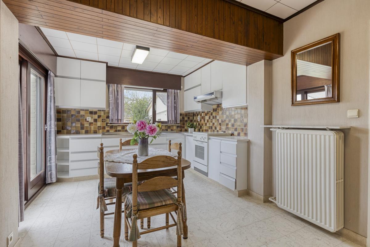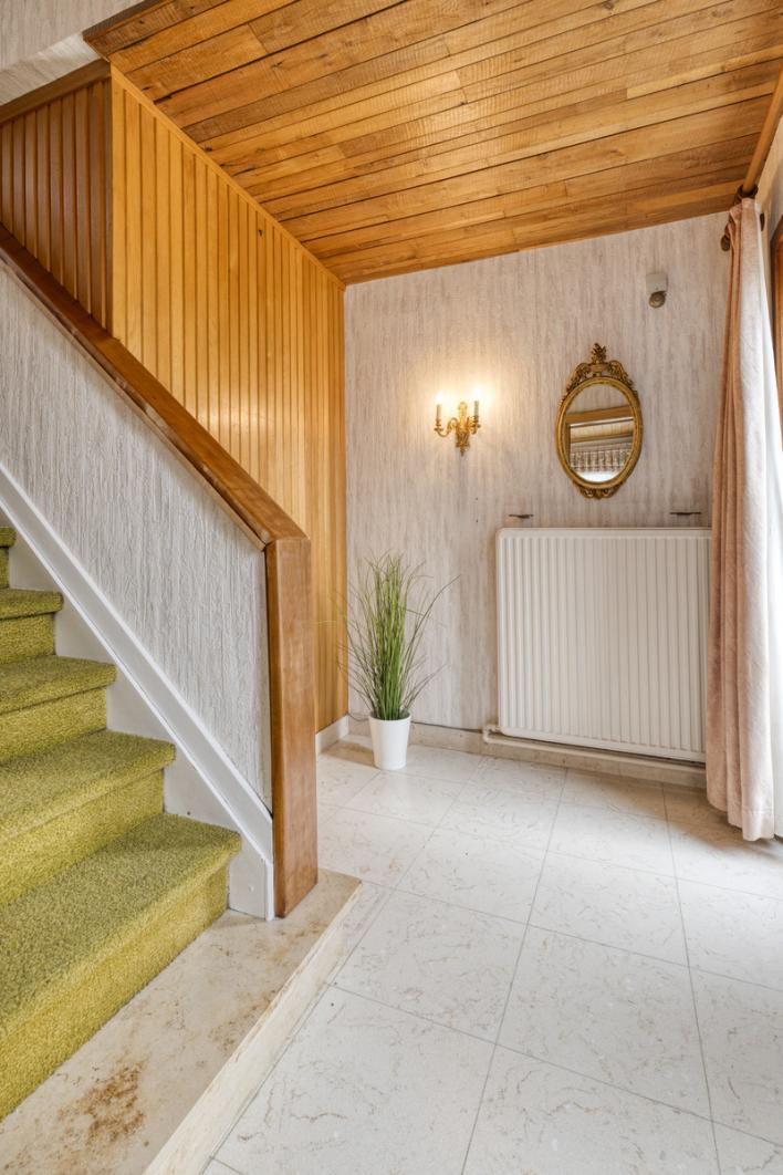 Deze verzorgde woning is ingedeeld op de gelijkvloerse verdieping met inkomhal met vestiaire en apart toilet, lichtrijke ruime living met openhaard, ruime ingerichte keuken met uitzicht op het terras en de grote tuin, bergruimte. Garage voor 1 wagen met extra bergruimte en voorzieningen voor wasmachine en droogkast. De eerste verdieping bestaat uit : nachthal, 4 slaapkamers waarvan 2 zeer ruime en een ingerichte badkamer met ligbad. Verder beschikt de woning over een stapelzolder, oprit, voortuin, ruime tuin, terras en opbergruimte. Dak reeds vernieuwd.